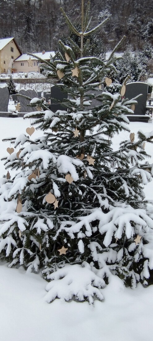 Obiskovalci pokopališča v Slovenske Konjice so na lesene okraske zapisovali svoje misli, posvetila in spomine ter jih obesili na drevo.