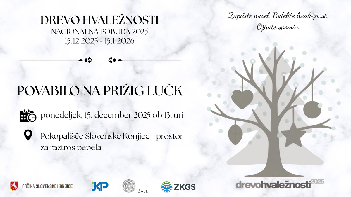 Na pobudo Žal bomo med 15. decembrom 2025 in 15. januarjem 2026 skupaj z več občinami in upravljavci pokopališč sodelovali v akciji Drevo hvaležnosti. Projekt je skupnostna, simbolna in trajnostna akcija, ki spodbuja kulturo hvaležnosti, spomina, topline, miru in povezanosti.